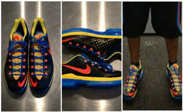 Recently Kevin Durant was seen wearing a new pair of Nike KD V Elite in an "OKC Away" makeup. Since then, there have been rumors that the kicks may actually be more than just a player exclusive and release this year. The next day, the shoes were spotted on Randy Williams as he hit the gym. The new colorway features a black base with orange, blue and yellow accents. There is not a hint on when these will release, but stay with